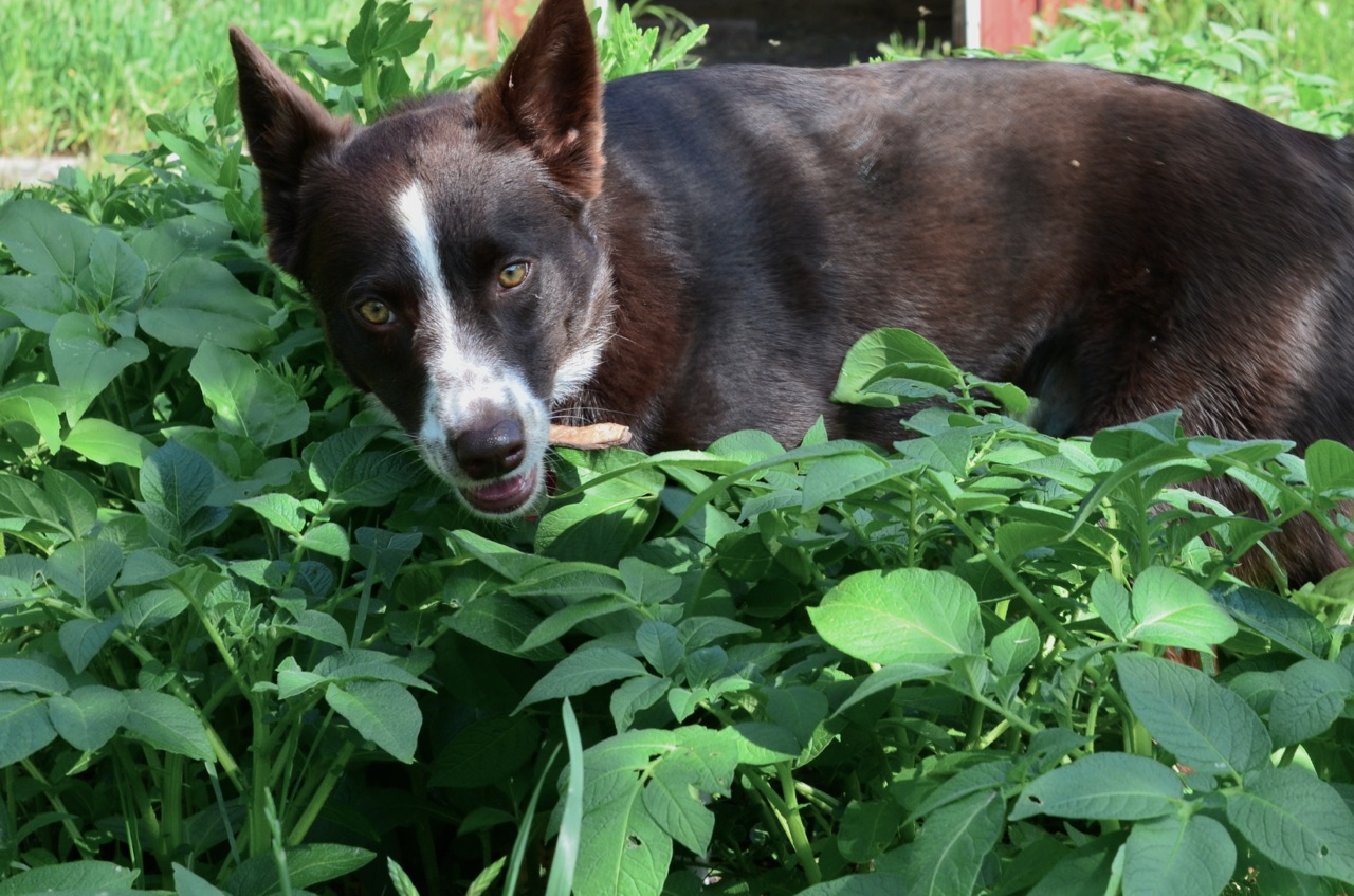 Bob loves to walk slowly through the potato patch sucking-up the aromas and getting it all over him.
