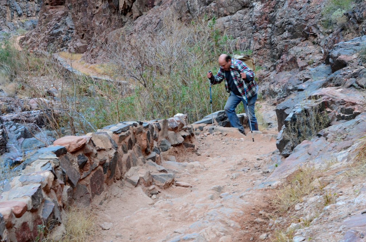 Macbeth’s despair of life’s meaning in the face of contrived struggle became a metaphor for our dangerous march down but a young Indian boy named Pi became the metaphor for our hike back up. Macbeth never found the meaning of life but Pi did, trapped on a lifeboat with an adult Bengal Tiger. In the better version of the tale. The Canyon is like an adult Bengal Tiger: it has no empathy, no compassion, and though beautiful, it is not your friend. Grand Canyon is an unforgiving wilderness. It forces you to confront things about playing above and below the rim. Starting down, you’re like a giddy 12 year-old who just wants to see the bottom of the Canyon. But the Canyon has other ideas. It teaches things you never knew about yourself and reminds you of things you forgot. Like being 60. You may not discover the meaning of life in the Canyon but life above the rim will mean a whole lot more after you walk with the ghosts at Phantom Ranch.