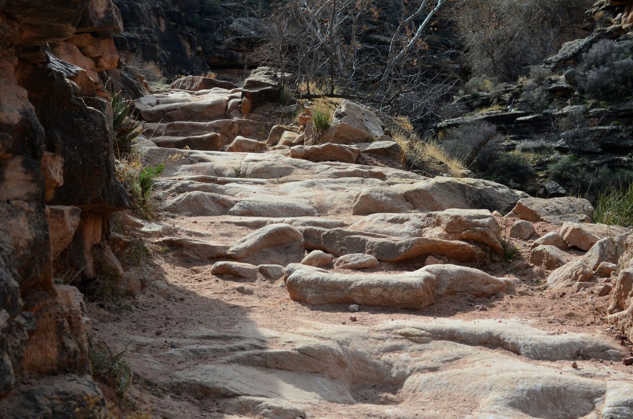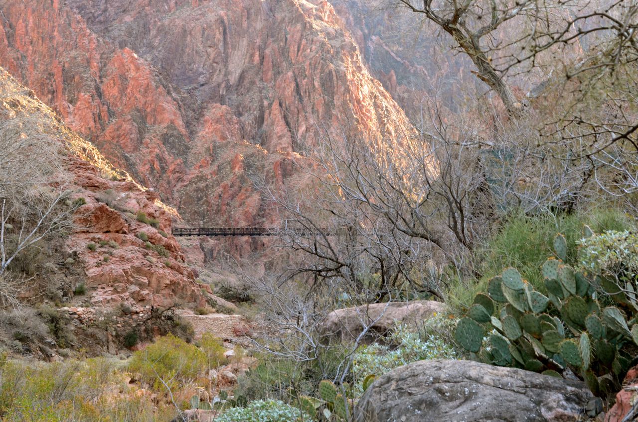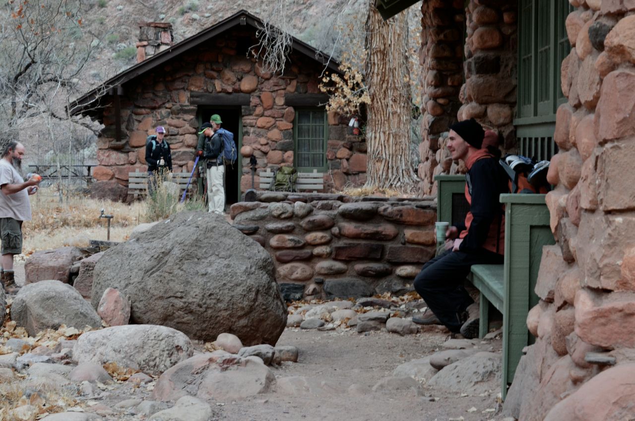 Phantom Ranch is a working camp on the floor of the Canyon … for a small fee on top of your Park entrance fee, you can be assured a hot evening meal, a warm bunk, hot breakfast, and a brown bag lunch for the hike back to the South Rim above … there are several tent campsites where most people stay … it was 17 degrees that night, we were beat to death, and grateful to have a warm bunk … the breakfast bell came right before dawn and it’s a good thing it did – we ended-up needing 12 hours to make it back up the Bright Angel Trail, the last 3 of which were in pitch black darkness on treacherous switchbacks overlooking drops of several hundred feet
